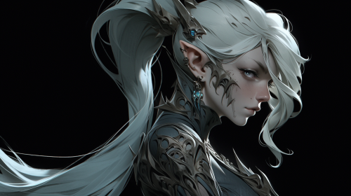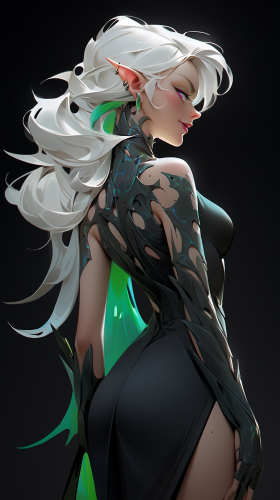 outstanding beauty of a demon woman with pale skin and glowing green tattoos, white hair in a ponytail, intense blue eyes with eyeliner, pointy ears with piercings, wearing a irridescent silk dress, unreal engine, octane render, fine details, cinematic lighting, backlit lighting, chromatic aberration --niji 5 --style expressive --s 1000 --ar 9:16