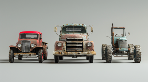 Create a realistic scene with three different types of vehicles: a large, robust truck, an older passenger car and a farm tractor. The truck should be powerful and large, the car elegant and urban, and the tractor traditional and weathered, without a background with only a shadow, about the front. --style raw --ar 16:9 --v 6.0