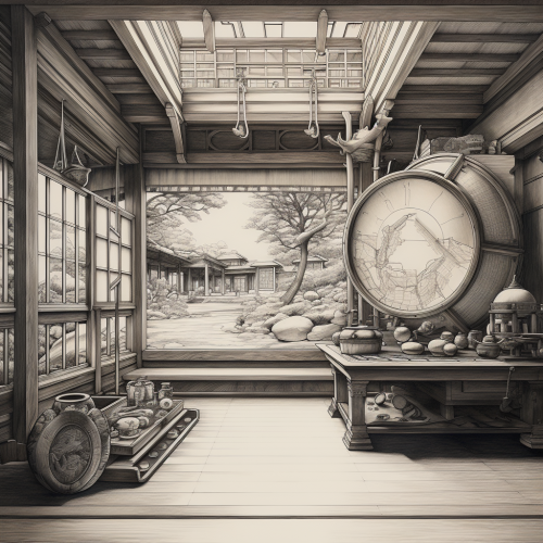 a beatiful chest in the middle of an ancient magestic japaneese room with circled windows, magestic, pencil drawing