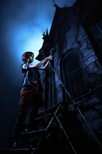 survival horror, dark midnight, rainy sky, dark black filter, very low angle, oblique view, near view point, oil painting, High transparency, A woman wearing shorts reloading a handgun while keeping an eye on her surroundings with a serious face, in creepy rusty and dirty sillent narrow corner in a gothic mansion, Atmosphere, dramatic, Cinematograph, very dramatic, photo, sharp focus, cinematic, highly photorealistic, ultra detail, black soft lighting, dark black foggy arround, HDR, 8k --ar 2:3