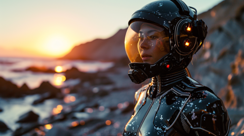 Wide-angle shot of an elegant black marble armored sci-fi astronaut power ranger on the beach. Her helmet reflects the bright red moon. Ethereal light, 70s polaroid film photography, Wes Anderson, Maxfield Parrish, Klimt, Kusama --chaos 7 --ar 16:9 --v 6.0 --s 750