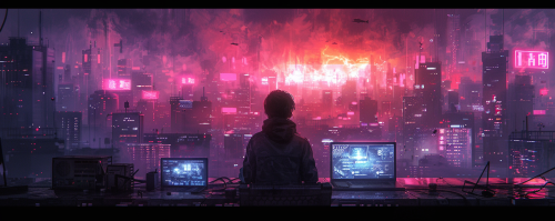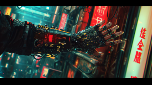 a half russain and half german scietist working hold a sleeve of high tech. in a cyberpunk settings. --ar 16:9 --v 6.0