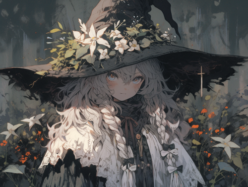 Vintage 70s anime witch, faded colors, scratched film look, tattered white robes, hollow eyes, gloomy forest, withered floral wreath, worn pointy hat, gnarly staff, cel animation style, grainy picture, ominous aura --ar 4:3 --stylize 1000 --niji 5 --seed 1234