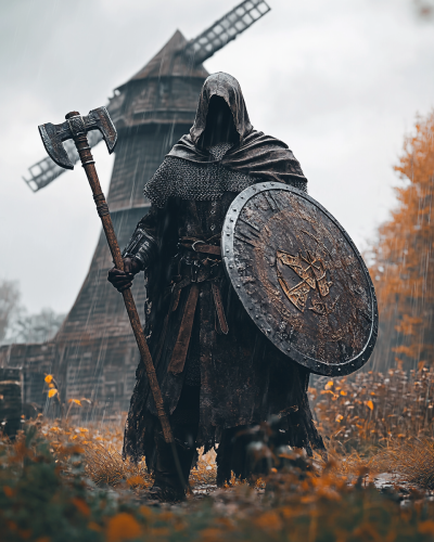 Full length front view photograph from D&D universe, war priest in combat stance, armed with war hammer and large shield, wearing chain mail armor, overcoat displaying fantasy religious symbol, old decaying medieval windmill in background, rainy and windy temperature of autumn season, gothic dramatic atmosphere, epic heroic dynamic posture, epic scene composition, shallow depth of field, soft volumetric cinematic lighting, soft natural color grading --ar 4:5 --v 6.1
