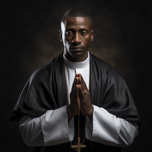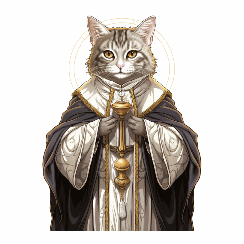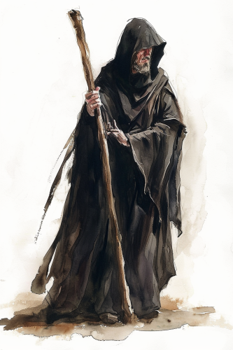 Epic fantasy. A realistic watercolor portrait of a thirty-year-old medieval priest in black robes preaching on a stage with a staff banging the stage. Minimalist. White background. --ar 6:9 --v 6.0