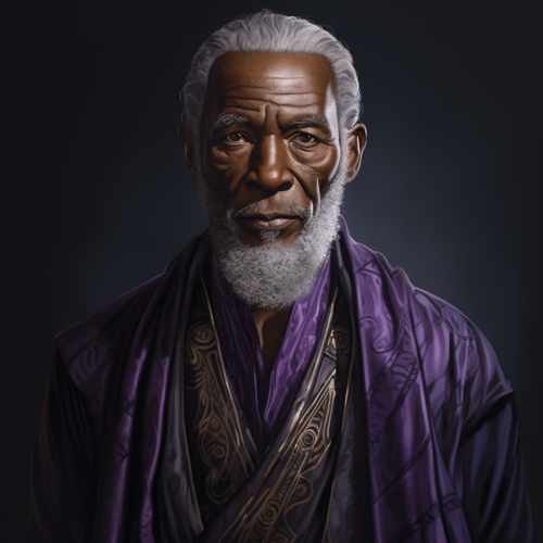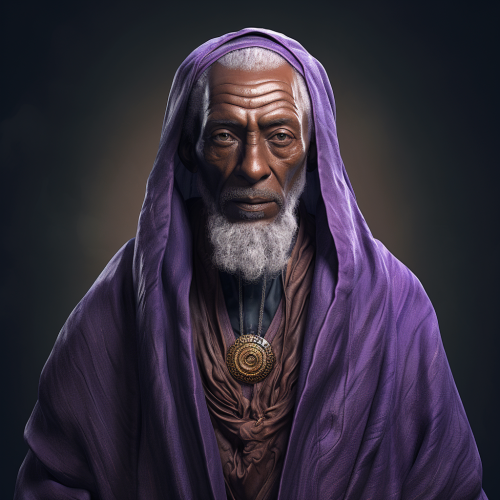 hyper realistic elderly elven male with dark skin wearing purple priest robes