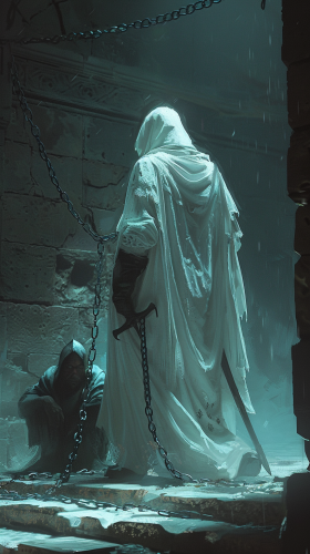 the grand inquisitor in his white robes questoins a suspect in a dungeon, dark medieval fantasy digital art --ar 9:16 --v 6.0