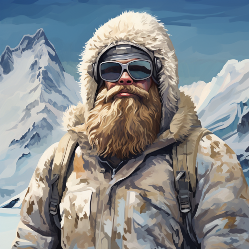 Painted portrait. Icelandic yeti in modern arctic tactical gear. Light climbing gear. Arctic camo. Thick winter coat and beanie. Goggles and gloves. Arctic forest mountain background