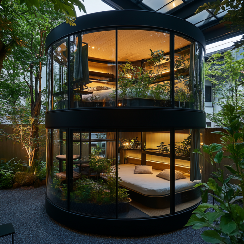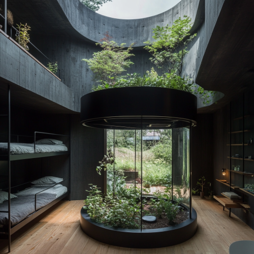 A sectional view of cabin, a circular glass room with black metal frame, inside the space is an indoor garden designed by Kengo Matsutani. Outside the window is a modern cabin made up of dark gray walls and flat roofs. There's natural sunlight shining through the skylight on top to illuminate the interior. bunker beds at each room,