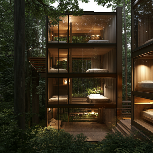 A sectional view of a modern black wood cabin in the raining forest. The cabin has a small open garden structured at center of the floor plan and separated by tall glass, each room of the floor has one sided glass panel wall from the center with bunk beds . The cabin has three floors with A shape roof with pierced peak center. The black wooden walls create a sleek exterior. Only the central glass panel offers a view of the weather conditions.