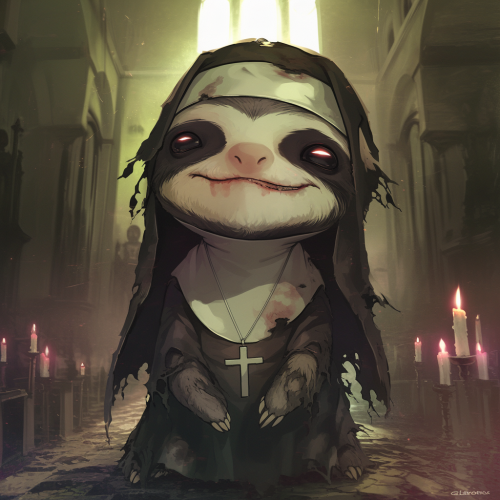 Create a frightening sloth with chibi proportions dressed as The Nun from The Conjuring 2. The sloth has a sloth-like face with twisted, malevolent features, and it wears a tattered, darkened nun’s habit. Its glowing eyes pierce through the darkness, and its headphones are styled to resemble a torn, corrupted nun’s veil. The sloth stands in a decaying, haunted church, surrounded by dark, flickering candles and ominous shadows. --niji 6
