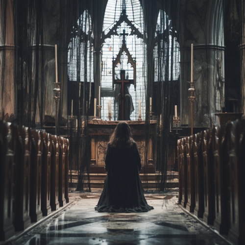 Filming the grandmother looking at the cross from the side, various people are praying while looking at the cross inside the church, full shot with the grandmother at the center, the grandmother is wearing a white blouse, the sacred feeling, the warm lighting, the warm sunlight coming down from the stained glass --ar 9:16 --iw 3.0