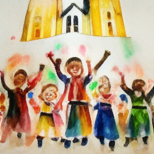 a colorful sketch of an architerctural rendering of a very large blank screen inside a tiny church