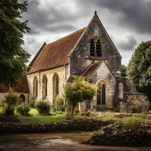 medieval church building, wood and stone structure without christian symbols. Small building belonging to a simple and poor community. Still they try their best to worship their gods. cloudy sky, threatening weather in the background foreshadows danger.