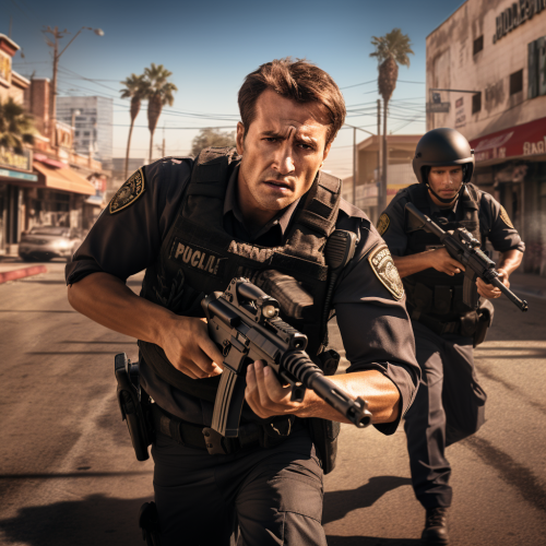 olice officers chasing with loaded guns in the public street a 35 years old skiny brown hair suspect and one brave strong citizen help police officers to stop him in realistic, cinematic stlye for youtube thumbnail