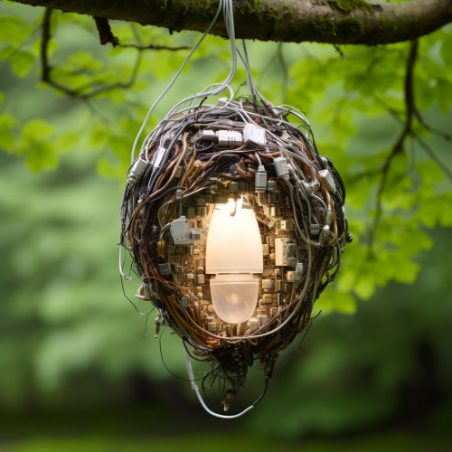 a cocoon made of it hardware and internet cables handing from a tree branch