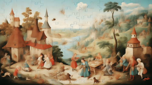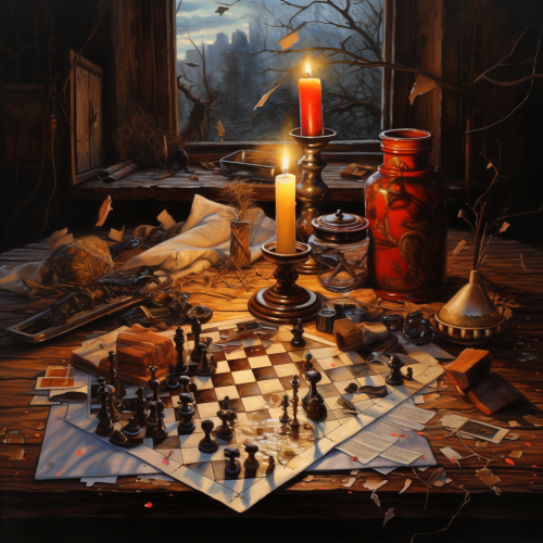 a broken puzzle on a wooden table, candle light, chess pieces, playing cards, thick oil painting