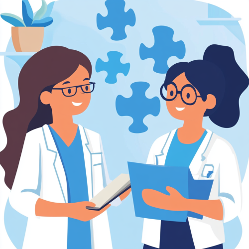 Female psychologist, woman, glasses, smiling, notebook, office, vivid, lifelike, blue puzzle pieces.