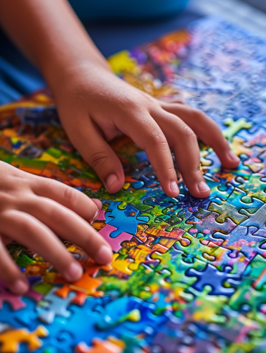 Close-up of a child's hands carefully selecting puzzle pieces, background shows parts of a colorful puzzle, bright and detailed image, crisp colors, realistic texture --ar 3:4 --v 6.0