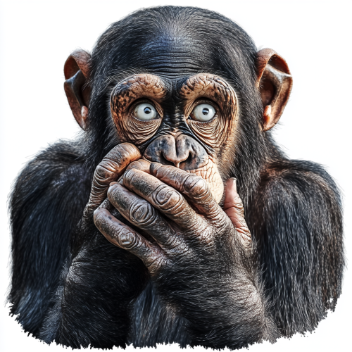 chimpanzee, with his hands covering his mouth with white eyes; realistic lighting; tattoo black and gray realism design; zoom out 2x; isolated on white background with clipping path