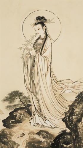 A traditional Chinese painting of guanyin. The image could depict her as a graceful and radiant figure, with her hands holding a little willow branch, and dressed in flowing white robes.--v 6.0 --style raw --ar 9:16