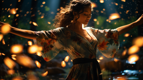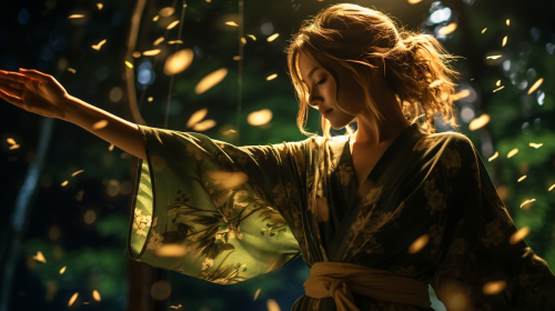A beautiful Japanese woman in kimono dancing beautifully ,Japanese bamboo forests and glowing fireflies at night,best quality, masterpiece, wide shot, full body shot, beautiful, 8K, background photo, dancing, braids, wide shot, full body shot, circle composition, dappled moonlight, wide-angle lens, long exposure, deep focus, dramatic contrast, --ar 16:9 --v 5.2 --s 250