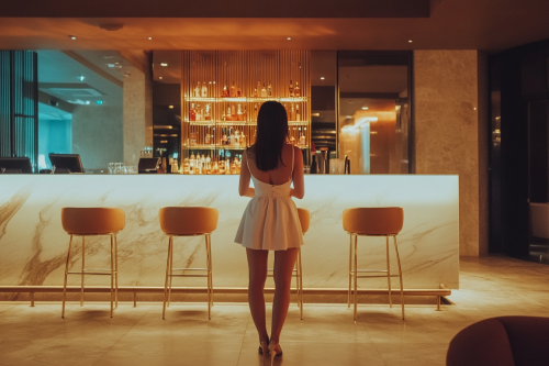 A 35-year-old Japanese woman with toned legs is enjoying her time at an upscale bar, dressed in elegant attire. The setting includes luxurious leather seats, a granite bar counter, dimmed pendant lights, and a background of fine spirits displayed neatly. --ar 3:2 --v 6.1 --style raw