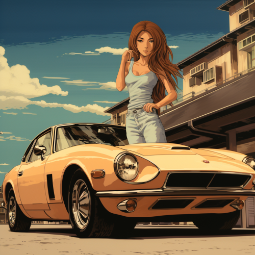 a classic datsun z car, japanese anime style, woman in front of car smoking and waiting to be helped