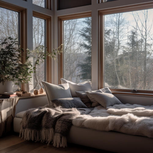 Sony a7iii photograph of dramatic cozy minimalist modern scandinavian style cottage interior in early winter with blankets and bold accent pillows, bright morning light --v 5.2