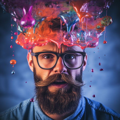 huge abstract drop of water on diffused picture of hipster, colorfull, almost caricature, no people