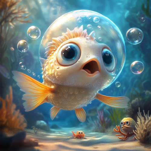 The central image features a cute, wide-eyed baby fish, like a baby pufferfish with an oversized head and tiny fins, in the middle of blowing a gigantic bubble that’s way bigger than itself. The bubble is so big that it has lifted the baby fish slightly off the seabed, causing it to float upward with a surprised and playful expression. The scene is filled with humorous details, like bubbles of different sizes floating around, and a few other small sea creatures (like a curious crab and a tiny starfish) looking up in surprise at the floating baby fish. - Fishdom mobile games style