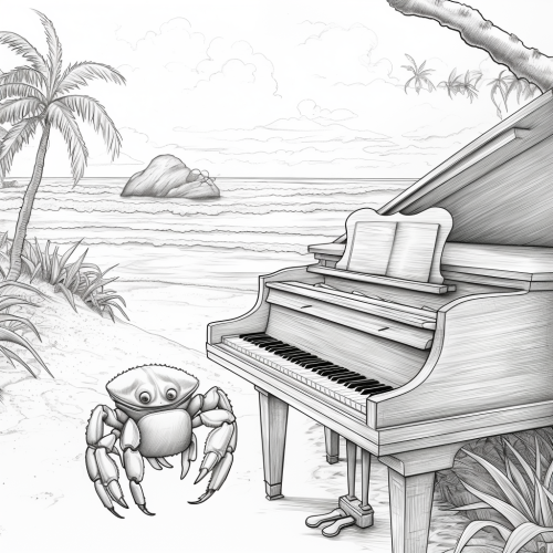 Colouring page, no shading, no greyscale, clear black lines, simple, A crab playing a tiny piano on a sandy island.