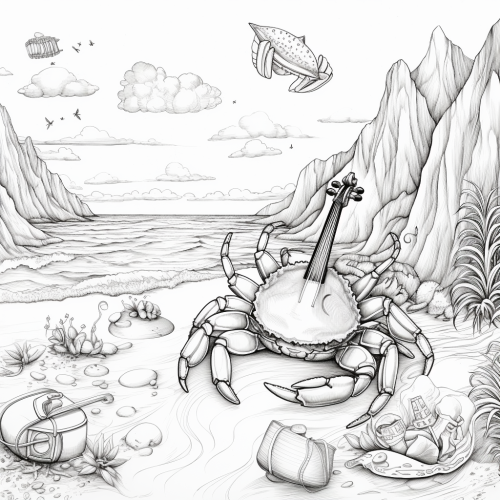 Colouring page, no shading, no greyscale, clear black lines, simple, A crab playing a tiny saxophone on a sandy island.