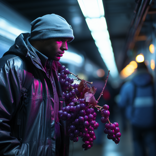 a bunch of gangsters in the form of a bunch of grapes Medium: Digital Photography. Style: Influenced by the street photography of Henri Cartier-Bresson, capturing the decisive moment. Lighting: Fluorescent lighting of the subway station, creating a modern urban atmosphere. Colors: A mix of cool blues and metallic grays to reflect the urban setting. Composition: Shot on a Fujifilm GFX 100S, GF32-64mmF4 R LM WR lens, Resolution 102 megapixels, ISO sensitivity: 12,800, Shutter speed 1/4000 second --s 750 --v 5.2