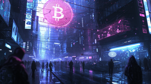 Generate a visually captivating cyberpunk-inspired image depicting Bitcoin as the linchpin of a digital and socially flourishing society. Picture a futuristic metropolis with towering skyscrapers, augmented reality interfaces, and a bustling network of interconnected individuals. Illuminate the scene with a blend of neon lights and holographic displays, showcasing Bitcoin at the heart of financial transactions, communication, and social connectivity. Emphasize the symbiotic relationship between the cryptocurrency and the technologically advanced, cyberpunk environment. Bring to life the narrative of a world where Bitcoin serves as the catalyst for both digital innovation and a vibrant, interconnected social fabric, all set against the backdrop of a dark, cyberpunk aesthetic photo taken with Canon EOS 5D Mark IV, Aperture: Set the aperture to f/1.8, Shutter Speed: Use 1/125th of a second, ISO: ISO 100. White Balance: Choose the appropriate white balance setting based on the lighting conditions in the room. Focus Mode: Select single-shot autofocus (AF-S) Metering Mode: Use evaluative or matrix metering mode for balanced exposure across the scene. Flash: Canon Speedlite 600EX II-RT, with a diffuser to soften the light and minimize harsh shadows. --ar 16:9 --v 6.0