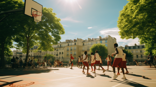 A film noir-inspired piece featuring a dramatic, shadowy basketball game in a rain-soaked, neon-lit city. The players wear trench coats and fedoras, and the court is set in a dark alley with mist and reflections from the wet pavement. The art captures the moody, suspenseful atmosphere of classic noir films --ar 2:3 --s 250 --v 6.1