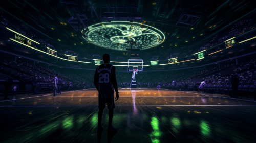 a montage of laker vs celtic basketball games, set in the year 2080, through a wide lens, cinematic, noir lighting, 8K --ar 16:9