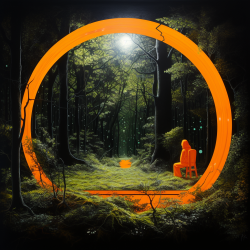 a glowing graphic circle of yellow light in the middle is a thin array of light lavendar green lilac pastel colors then another glowing grphic circle of yellow light of oranges