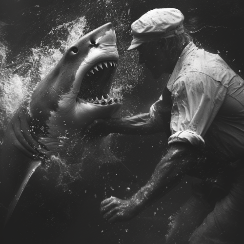 close sailor fighting shark underwater,surreal,monochrome --s 250 --v 6.0