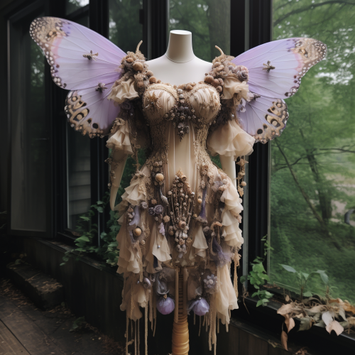 a rennessance faire realistic outfit that's a dress for a fairy that's covered in mushrooms and pearls with purple wings
