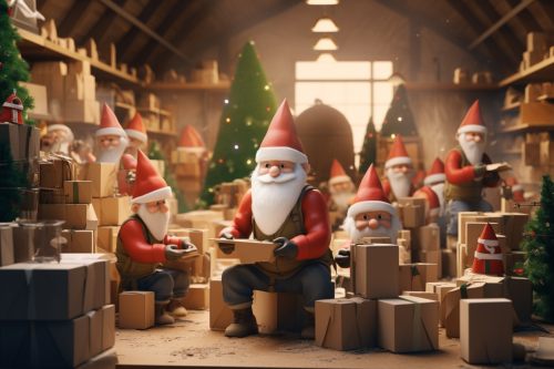 christmas gift factory, crane picking gifts up, wired with christmas lights, candy canes, gifts, elfs running,