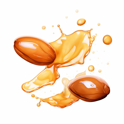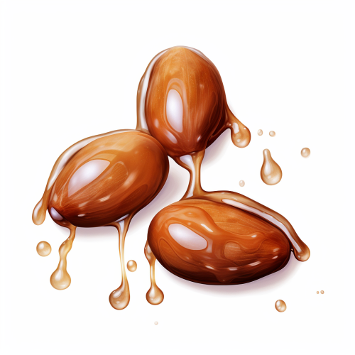 pencile style colored illustration of two argan seeds placed in the air, with a slight oil dropping on the gorund, on white background