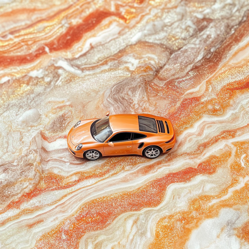 realistic hyperealistic top angle closeup shot of superdetailed marble wallpaper that features shiny orange glitter, a shining Porsche 911 parking on top, in the style of crystals, close-up, fanciful, dreamlike imagery, orange, flowing fabrics, eye-catching resin jewelry, and cute and dreamy hdr --v 6.1