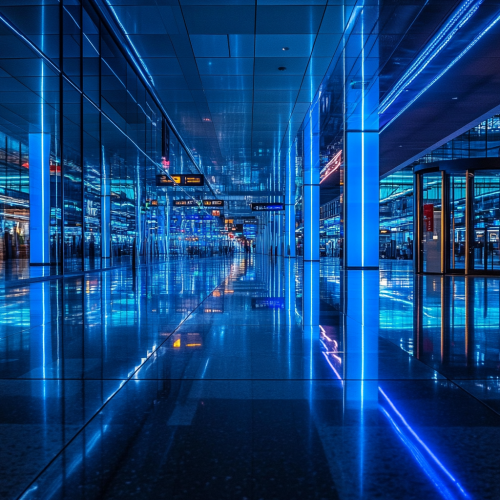 Der Flughafen Hamburg ist ein hochmodernes, von Megakonzernen kontrolliertes Drehkreuz. Drohnen patrouillieren die Sicherheitszonen, während AR-Werbetafeln über den Terminals schweben. Blau gehaltene Neonlichter spiegeln sich auf der glänzenden Metallarchitektur, während Sicherheitskräfte die Menschenmengen überwachen