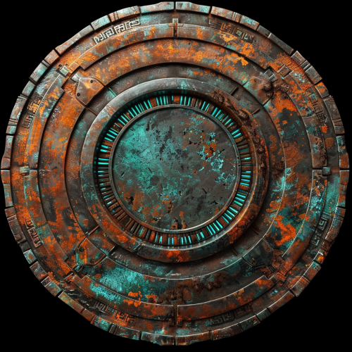 circular artwork, flat 2d style, hyper realistic futuristic digital mixed texture of rusted metal, futuristic super shiny metal, leather and wood, ancient VS futuristic, covered in little moss, realistic, insanely detailed, ornamented, mysterious inscriptions, octane render, cinematic, fotorealistic, blue and orange colours with green digital led lights, octane render, insanely detailed, HD, 8K