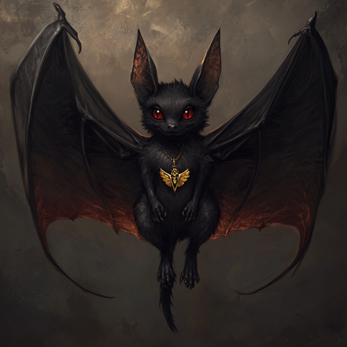 A midnight black bat with slightly shiny fur. The bat has an elegant and dangerous appearance, yet cute large red eye. The fur on her wings shimmers slightly reddish on the edges, giving her a dynamic and athletic appearance in flight. On her chest she wears a small golden medallion in the shape of a stylized bat with black filling. Fantasy art.