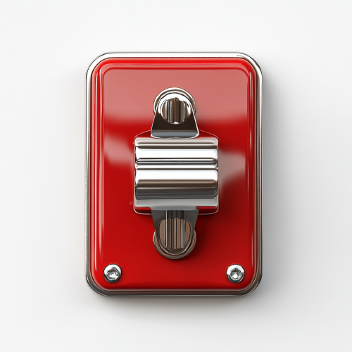 Small metallic toggle switch with a shiny metal lever, red rectangular base, and three visible metal prongs, viewed from above, detailed and realistic, white background, no shadows --ar 1:1 --s 250 --style raw