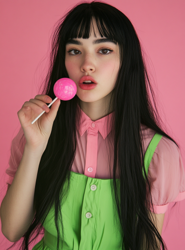 A photograph of a woman with long black hair, eating a pink sphere lollipop while wearing a green lime dress and a pink shirt in a y2k outfit. Her expression on her face is neutral, but she has visible signs of an alcohol hangover and blink to a camera with one eye. It's a unique style that adds an artistic touch to your photo collection. --ar 54:73
