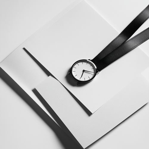 A watch placed on top of three flat sheets of paper, with a white background and a minimalist style. The lighting is soft and even, highlighting the details of each sheet of paper. A close-up shot showcases an elegant black leather strap wrapped around one corner of the papers, adding depth to the composition. This photo was taken in the style of Hasselblad cameras, presenting high-definition and ultra-realistic textures.