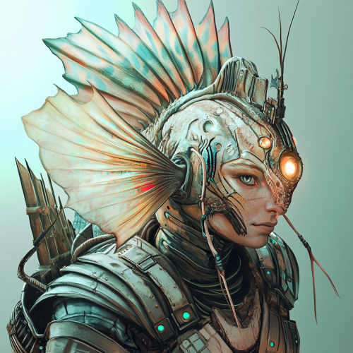Humanoid character that resembles a lionfish. She has a bioluminescent lure on her forehead and fins on the sides of her head, but a more humanoid face. She is a fighter with plate armor and and a crossbow strapped to her back. Can you make this in a comic style